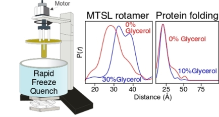 ABSTRACT: Double electron-electron resonance (DEER) EPR spectroscopy is a powerful method for obtaining distance distributions between pairs of engineered nitroxide spin-labels in proteins and other biological macromolecules. These measurements require the use of cryogenic temperatures (77 K or less) to prolong the phase memory relaxation time (Tm) sufficiently to enable detection of a DEER echo curve. Generally, a cryoprotectant such as glycerol is added to protein samples to facilitate glass formation and avoid protein clustering (which can result in a large decrease in Tm) during relatively slow flash freezing in liquid N2. However, cryoprotectants are osmolytes and can influence protein folding/unfolding equilibria, as well as species populations in weak multimeric systems. Here we show that submillisecond rapid freezing, achieved by high velocity spraying of the sample onto a rapidly spinning, liquid nitrogen cooled copper disc obviates the requirement for cryoprotectants and permits high quality DEER data to be obtained in absence of glycerol. We demonstrate this approach on five different protein systems: protein A, the metastable drkN SH3 domain, urea-unfolded drkN SH3, HIV-1 reverse transcriptase, and the transmembrane domain of HIV-1 gp41 in lipid bicelles.