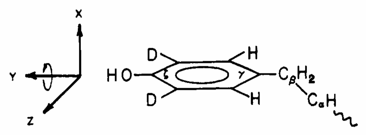 ABSTRACT: Deuterium NMR spectra of polycrystalline [tyrosine-3,5-2H2] [Leu5]enkephalin show that the aromatic tyrosyl ring of this pentapeptide is executing 180° flips about the Cβ-Cγ axis in the solid state. Specifically, the axially symmetric powder pattern observed at low temperature collapses to an axially asymmetric pattern with η ≃ 0.6 at high temperature. Computer simulations of the NMR line shapes, which account for spectral distortions induced by the quadrupole echo technique, indicate that at room temperature the flipping rate is approximately 5 × 104 s−1 and that it increases to about 106 s−1 at 101 °C.