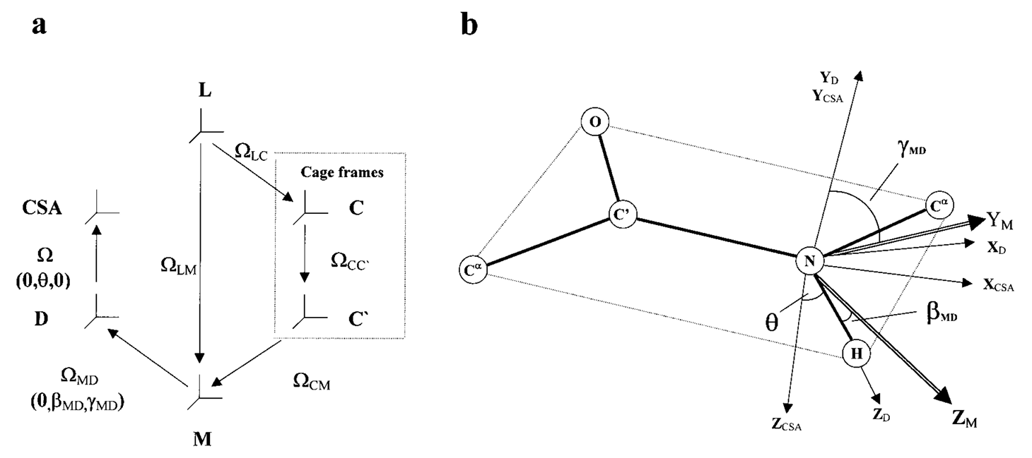 ABSTRACT: The two-body Slowly Relaxing Local Structure (SRLS) model was applied to 15N NMR spin relaxation in proteins and compared with the commonly used original and extended model-free (MF) approaches. In MF, the dynamic modes are assumed to be decoupled, local ordering at the N−H sites is represented by generalized order parameters, and internal motions are described by effective correlation times. SRLS accounts for dynamical coupling between the global diffusion of the protein and the internal motion of the N−H bond vector. The local ordering associated with the coupling potential and the internal N−H diffusion are tensors with orientations that may be tilted relative to the global diffusion and magnetic frames. SRLS generates spectral density functions that differ from the MF formulas. The MF spectral densities can be regarded as limiting cases of the SRLS spectral density. SRLS-based model-fitting and model-selection schemes similar to the currently used MF-based ones were devised, and a correspondence between analogous SRLS and model-free parameters was established. It was found that experimental NMR data are sensitive to the presence of mixed modes. Our results showed that MF can significantly overestimate order parameters and underestimate local motion correlation times in proteins. The extent of these digressions in the derived microdynamic parameters is estimated in the various parameter ranges, and correlated with the time scale separation between local and global motions. The SRLS-based analysis was tested extensively on 15N relaxation data from several isotropically tumbling proteins. The results of SRLS-based fitting are illustrated with RNase H from E. coli, a protein extensively studied previously with MF.
