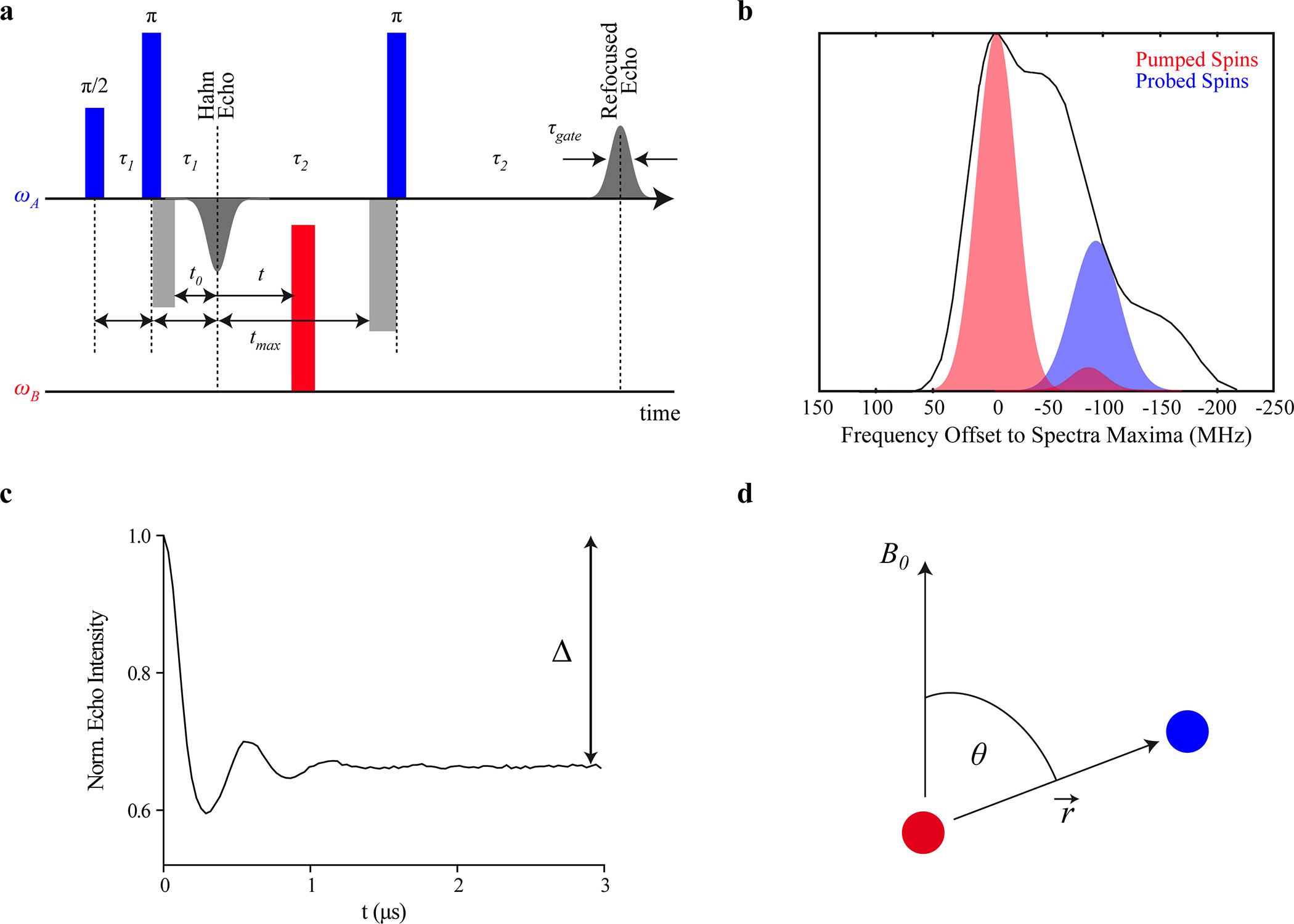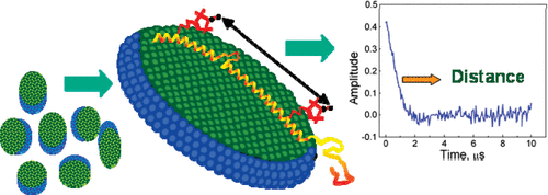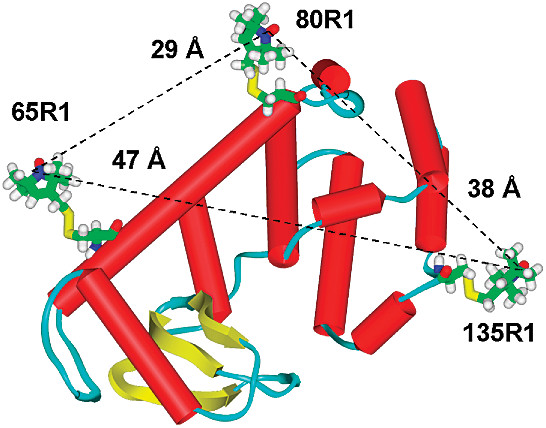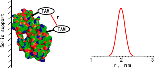 ABSTRACT: Pulsed electron spin resonance (ESR) dipolar spectroscopy (PDS) in combination with site-directed spin labeling is unique in providing nanometer-range distances and distributions in biological systems. To date, most of the pulsed ESR techniques require frozen solutions at cryogenic temperatures to reduce the rapid electron spin relaxation rate and to prevent averaging of electron–electron dipolar interaction due to the rapid molecular tumbling. To enable measurements in liquid solution, we are exploring a triarylmethyl (TAM)-based spin label with a relatively long relaxation time where the protein is immobilized by attachment to a solid support. In this preliminary study, TAM radicals were attached via disulfide linkages to substituted cysteine residues at positions 65 and 80 or 65 and 76 in T4 lysozyme immobilized on Sepharose. Interspin distances determined using double quantum coherence (DQC) in solution are close to those expected from models, and the narrow distance distribution in each case indicates that the TAM-based spin label is relatively localized.