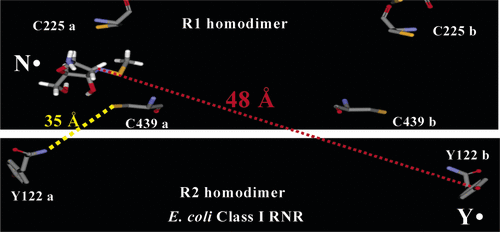 ABSTRACT: The class I E. coli ribonucleotide reductase, composed of homodimers of R1 and R2, catalyzes the conversion of nucleoside diphosphates to deoxynucleoside diphosphates. The reduction process involves the tyrosyl radical on R2 that generates a transient thiyl radical on R1 over a proposed distance of 35 Å. A mechanism-based inhibitor, 2′-azido-2′-deoxyuridine-5′-diphosphate, that reduces the tyrosyl radical on R2 and forms a nitrogen-centered radical on R1 has provided a method to measure the diagonal distance between the two subunits. PELDOR and DQC paramagnetic resonance methods give rise to a distance of 48 Å, similar to that calculated from a docking model of the R1 and R2 structures.