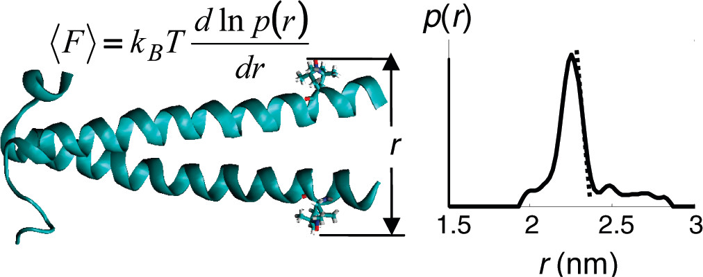 ABSTRACT: A new method for measuring forces between small protein domains based on double electron−electron resonance (DEER) spectroscopy is demonstrated using a model peptide derived from the α-helical coiled-coil leucine zipper of yeast transcriptional activator GCN4. The equilibrium distribution of distances between two nitroxide spin labels rigidly attached to the helices of the dimer was determined by DEER and yielded a closing force of 100 ± 10 pN between monomers, in excellent agreement with theoretical predictions.