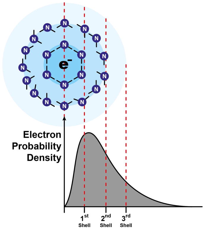 ABSTRACT: Electron transfer or quantum tunneling dynamics for excess or solvated electrons in dilute lithium–ammonia solutions have been studied by pulse electron paramagnetic resonance (EPR) spectroscopy at both X- (9.7 GHz) and W-band (94 GHz) frequencies. The electron spin–lattice (T1) and spin–spin (T2) relaxation data indicate an extremely fast transfer or quantum tunneling rate of the solvated electron in these solutions which serves to modulate the hyperfine (Fermi-contact) interaction with nitrogen nuclei in the solvation shells of ammonia molecules surrounding the localized, solvated electron. The donor and acceptor states of the solvated electron in these solutions are the initial and final electron solvation sites found before, and after, the transfer or tunneling process. To interpret and model our electron spin relaxation data from the two observation EPR frequencies requires a consideration of a multiexponential correlation function. The electron transfer or tunneling process that we monitor through the correlation time of the nitrogen Fermi-contact interaction has a time scale of (1–10) × 10–12 s over a temperature range 230–290 K in our most dilute solution of lithium in ammonia. Two types of electron–solvent interaction mechanisms are proposed to account for our experimental findings. The dominant electron spin relaxation mechanism results from an electron tunneling process characterized by a variable donor–acceptor distance or range (consistent with such a rapidly fluctuating liquid structure) in which the solvent shell that ultimately accepts the transferring electron is formed from random, thermal fluctuations of the liquid structure in, and around, a natural hole or Bjerrum-like defect vacancy in the liquid. Following transfer and capture of the tunneling electron, further solvent-cage relaxation with a time scale of ˜10–13 s results in a minor contribution to the electron spin relaxation times. This investigation illustrates the great potential of multifrequency EPR measurements to interrogate the microscopic nature and dynamics of ultrafast electron transfer or quantum-tunneling processes in liquids. Our results also impact on the universal issue of the role of a host solvent (or host matrix, e.g. a semiconductor) in mediating long-range electron transfer processes and we discuss the implications of our results with a range of other materials and systems exhibiting the phenomenon of electron transfer.