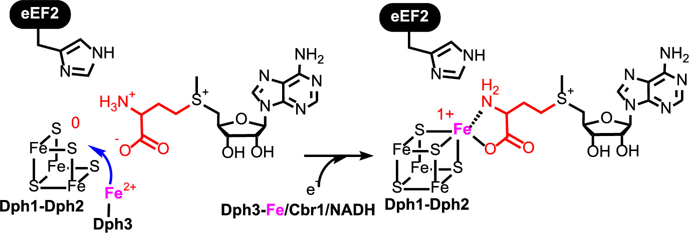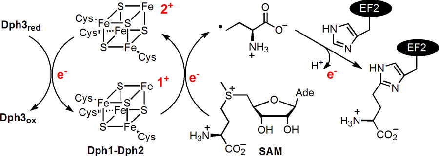ABSTRACT: Diphthamide, the target of diphtheria toxin, is a unique posttranslational modification on translation elongation factor 2 (EF2) in archaea and eukaryotes. The biosynthesis of diphthamide was proposed to involve three steps. The first step is the transfer of the 3-amino-3-carboxypropyl group from S-adenosyl-L-methionine (SAM) to the histidine residue of EF2, forming a C–C bond. Previous genetic studies showed this step requires four proteins in eukaryotes, Dph1–Dph4. However, the exact molecular functions for the four proteins are unknown. Previous study showed that Pyrococcus horikoshii Dph2 (PhDph2), a novel iron-sulfur cluster-containing enzyme, forms a homodimer and is sufficient for the first step of diphthamide biosynthesis in vitro. Here we demonstrate by in vitro reconstitution that yeast Dph1 and Dph2 form a complex (Dph1-Dph2) that is equivalent to the homodimer of PhDph2 and is sufficient to catalyze the first step in vitro in the presence of dithionite as the reductant. We further demonstrate that yeast Dph3 (also known as KTI11), a CSL-type zinc finger protein, can bind iron and in the reduced state can serve as an electron donor to reduce the Fe-S cluster in Dph1-Dph2. Our study thus firmly establishes the functions for three of the proteins involved in eukaryotic diphthamide biosynthesis. For most radical SAM enzymes in bacteria, flavodoxins and flavodoxin reductases are believed to serve as electron donors for the Fe-S clusters. The finding that Dph3 is an electron donor for the Fe-S clusters in Dph1-Dph2 is thus interesting and opens up new avenues of research on electron transfer to Fe-S proteins in eukaryotic cells.