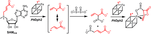 ABSTRACT: Pyrococcus horikoshii Dph2 (PhDph2) is an unusual radical S-adenosylmethionine (SAM) enzyme involved in the first step of diphthamide biosynthesis. It catalyzes the reaction by cleaving SAM to generate a 3-amino-3-carboxypropyl (ACP) radical. To probe the reaction mechanism, we synthesized a SAM analogue (SAMCA), in which the ACP group of SAM is replaced with a 3-carboxyallyl group. SAMCA is cleaved by PhDph2, yielding a paramagnetic (S = 1/2) species, which is assigned to a complex formed between the reaction product, α-sulfinyl-3-butenoic acid, and the [4Fe-4S] cluster. Electron–nuclear double resonance (ENDOR) measurements with 13C and 2H isotopically labeled SAMCA support a π-complex between the C=C double bond of α-sulfinyl-3-butenoic acid and the unique iron of the [4Fe-4S] cluster. This is the first example of a radical SAM-related [4Fe-4S]+ cluster forming an organometallic complex with an alkene, shedding additional light on the mechanism of PhDph2 and expanding our current notions for the reactivity of [4Fe-4S] clusters in radical SAM enzymes.