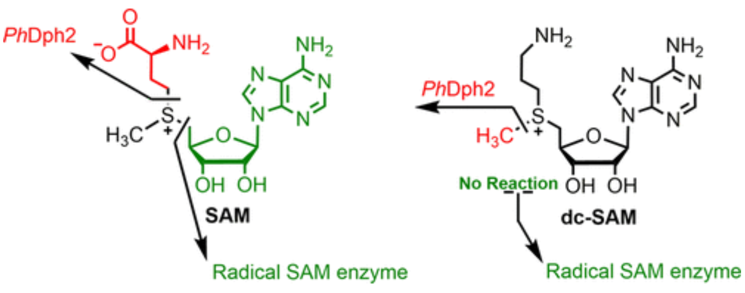 ABSTRACT: S-Adenosylmethionine (SAM) has a sulfonium ion with three distinct C-S bonds. Conventional radical SAM enzymes use a [4Fe-4S] cluster to cleave homolytically the C5′,adenosine-S bond of SAM to generate a 5′-deoxyadenosyl radical, which catalyzes various downstream chemical reactions. Radical SAM enzymes involved in diphthamide biosynthesis, such as Pyrococcus horikoshii Dph2 (PhDph2) and yeast Dph1-Dph2 instead cleave the Cγ,Met-S bond of methionine to generate a 3-amino-3-carboxylpropyl radical. We here show radical SAM enzymes can be tuned to cleave the third C-S bond to the sulfonium sulfur by changing the structure of SAM. With a decarboxyl SAM analogue (dc-SAM), PhDph2 cleaves the Cmethyl-S bond, forming 5′-deoxy-5′-(3-aminopropylthio) adenosine (dAPTA, 1). The methyl cleavage activity, like the cleavage of the other two C-S bonds, is dependent on the presence of a [4Fe-4S]+ cluster. Electron-nuclear double resonance and mass spectroscopy data suggests that mechanistically one of the S atoms in the [4Fe-4S] cluster captures the methyl group from dc-SAM, forming a distinct EPR-active intermediate, which can transfer the methyl group to nucleophiles such as dithiothreitol. This reveals the [4Fe-4S] cluster in a radical SAM enzyme can be tuned to cleave any one of the three bonds to the sulfonium sulfur of SAM or analogues, and is the first demonstration a radical SAM enzyme could switch from an Fe-based one electron transfer reaction to a S-based two electron transfer reaction in a substrate-dependent manner. This study provides an illustration of the versatile reactivity of Fe-S clusters.