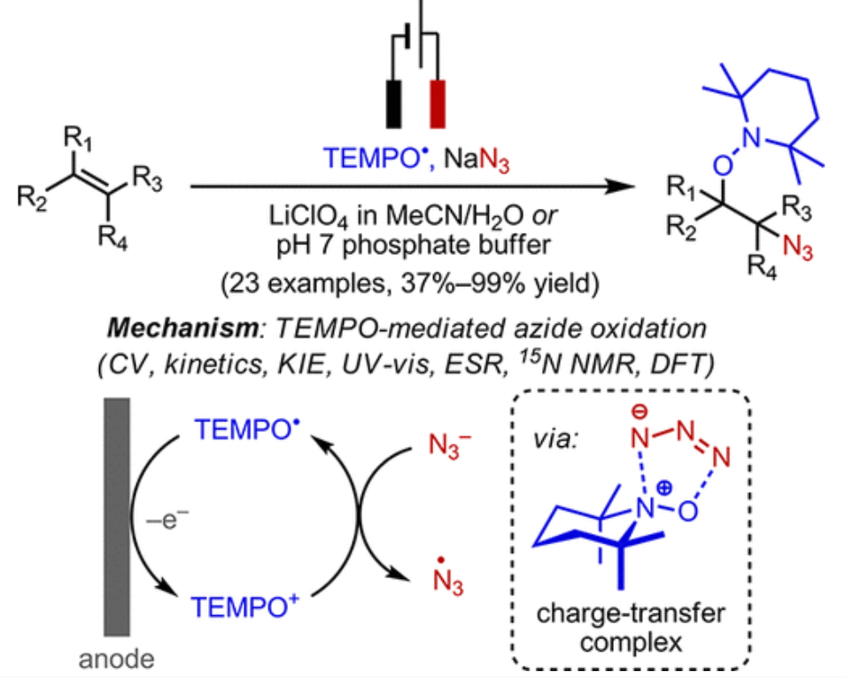 ABSTRACT: We report a mild and efficient electrochemical protocol to access a variety of vicinally C–O and C–N difunctionalized compounds from simple alkenes. Detailed mechanistic studies revealed a distinct reaction pathway from those previously reported for TEMPO-mediated reactions. In this mechanism, electrochemically generated oxoammonium ion facilitates the formation of azidyl radical via a charge-transfer complex with azide, TEMPO–N3. DFT calculations together with spectroscopic characterization provided a tentative structural assignment of this charge-transfer complex. Kinetic and kinetic isotopic effect studies revealed that reversible dissociation of TEMPO–N3 into TEMPO⋅ and azidyl precedes the addition of these radicals across the alkene in the rate-determining step. The resulting azidooxygenated product could then be easily manipulated for further synthetic elaborations. The discovery of this new reaction pathway mediated by the TEMPO+/TEMPO⋅ redox couple may expand the scope of aminoxyl radical chemistry in synthetic contexts.