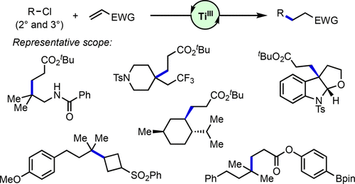 ABSTRACT: Alkyl chlorides are common functional groups in synthetic organic chemistry. However, the engagement of unactivated alkyl chlorides, especially tertiary alkyl chlorides, in transition-metal-catalyzed C–C bond formation remains challenging. Herein, we describe the development of a TiIII-catalyzed radical addition of 2° and 3° alkyl chlorides to electron-deficient alkenes. Mechanistic data are consistent with inner-sphere activation of the C–Cl bond featuring TiIII-mediated Cl atom abstraction. Evidence suggests that the active TiIII catalyst is generated from the TiIV precursor in a Lewis-acid-assisted electron transfer process.