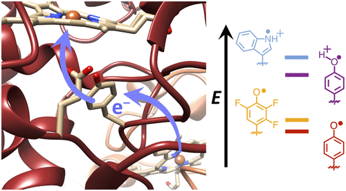 ABSTRACT: Transient tyrosine and tryptophan radicals play key roles in the electron transfer (ET) reactions of photosystem (PS) II, ribonucleotide reductase (RNR), photolyase, and many other proteins. However, Tyr and Trp are not functionally interchangeable, and the factors controlling their reactivity are often unclear. Cytochrome c peroxidase (CcP) employs a Trp191⋅+ radical to oxidize reduced cytochrome c (Cc). Although a Tyr191 replacement also forms a stable radical, it does not support rapid ET from Cc. Here we probe the redox properties of CcP Y191 by non-natural amino acid substitution, altering the ET driving force and manipulating the protic environment of Y191. Higher potential fluorotyrosine residues increase ET rates marginally, but only addition of a hydrogen bond donor to Tyr191⋅ (via Leu232His or Glu) substantially alters activity by increasing the ET rate by nearly 30-fold. ESR and ESEEM spectroscopies, crystallography, and pH-dependent ET kinetics provide strong evidence for hydrogen bond formation to Y191⋅ by His232/Glu232. Rate measurements and rapid freeze quench ESR spectroscopy further reveal differences in radical propagation and Cc oxidation that support an increased Y191⋅ formal potential of ∼200 mV in the presence of E232. Hence, Y191 inactivity results from a potential drop owing to Y191⋅+ deprotonation. Incorporation of a well-positioned base to accept and donate back a hydrogen bond upshifts the Tyr⋅ potential into a range where it can effectively oxidize Cc. These findings have implications for the YZ/YD radicals of PS II, hole-hopping in RNR and cryptochrome, and engineering proteins for long-range ET reactions.