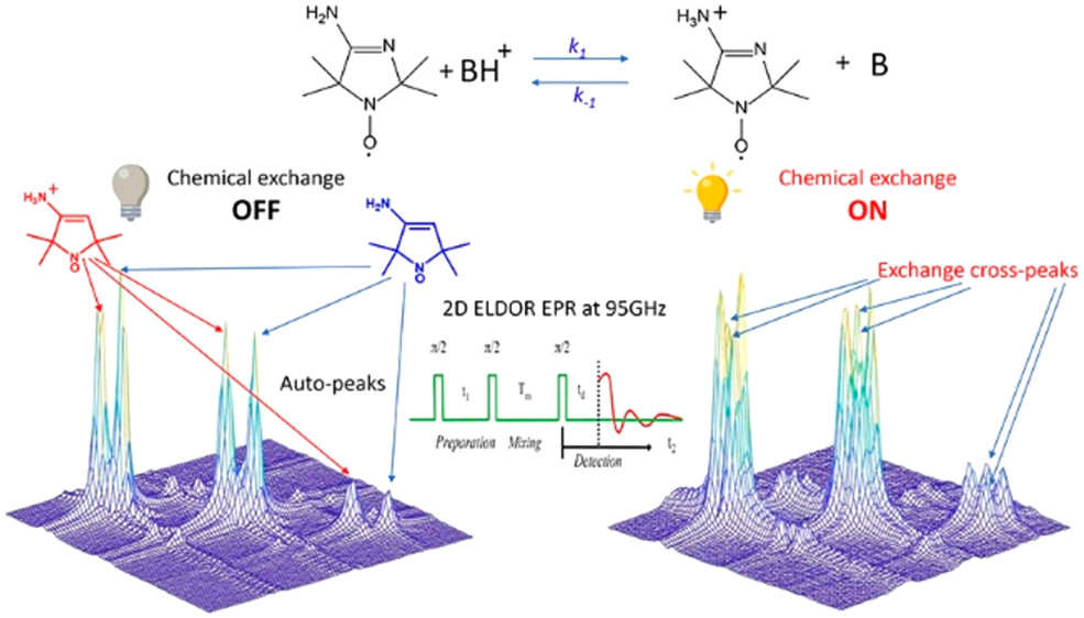ABSTRACT: Exchange processes which include conformational change, protonation/deprotonation, and binding equilibria are routinely studied by 2D exchange NMR techniques, where information about the exchange of nuclei between environments with different NMR shifts is obtained from the development of cross‐peaks. Whereas 2D NMR enables the real time study of millisecond and slower exchange processes, 2D ESR in the form of 2D‐ELDOR (two‐dimensional electron‐electron double resonance) has the potential for such studies over the nanosecond to microsecond real time scales. Cross‐peak development due to chemical exchange has been seen previously for semiquinones in ESR, but this is not possible for most common ESR probes, such as nitroxides, studied at typical ESR frequencies because, unlike NMR, the exchanging states yield ESR signals that are not resolved from each other within their respective line widths. But at 95 GHz, it becomes possible to resolve them in many cases because of the increased g‐factor resolution. The 95 GHz instrumental developments occurring at ACERT now enable such studies. We demonstrate these new capabilities in two studies: (A) the protonation/deprotonation process for a pH‐sensitive imidazoline spin label in aqueous solution where the exchange rate and the population ratio of the exchanging states are controlled by the concentration and pH of the buffer solution, respectively, and (B) a nitroxide radical partitioning between polar (aqueous) and nonpolar (phospholipid) environments in multilamellar lipid vesicles, where the cross‐peak development arises from the exchange of the nitroxide between the two phases. This work represents the first example of the observation and analysis of cross‐peaks arising from chemical exchange processes involving nitroxide spin labels.