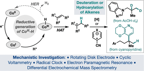 ABSTRACT: Hydrogen-atom transfer mediated by earth-abundant transition-metal hydrides (M-Hs) has emerged as a powerful tool in organic synthesis. Current methods to generate M-Hs most frequently rely on oxidatively initiated hydride transfer. Herein, we report a reductive approach to generate Co–H, which allows for canonical hydrogen evolution reactions to be intercepted by hydrogen-atom transfer to an alkene. Electroanalytical and spectroscopic studies provided mechanistic insights into the formation and reactivity of Co–H, which enabled the development of two new alkene hydrofunctionalization reactions.