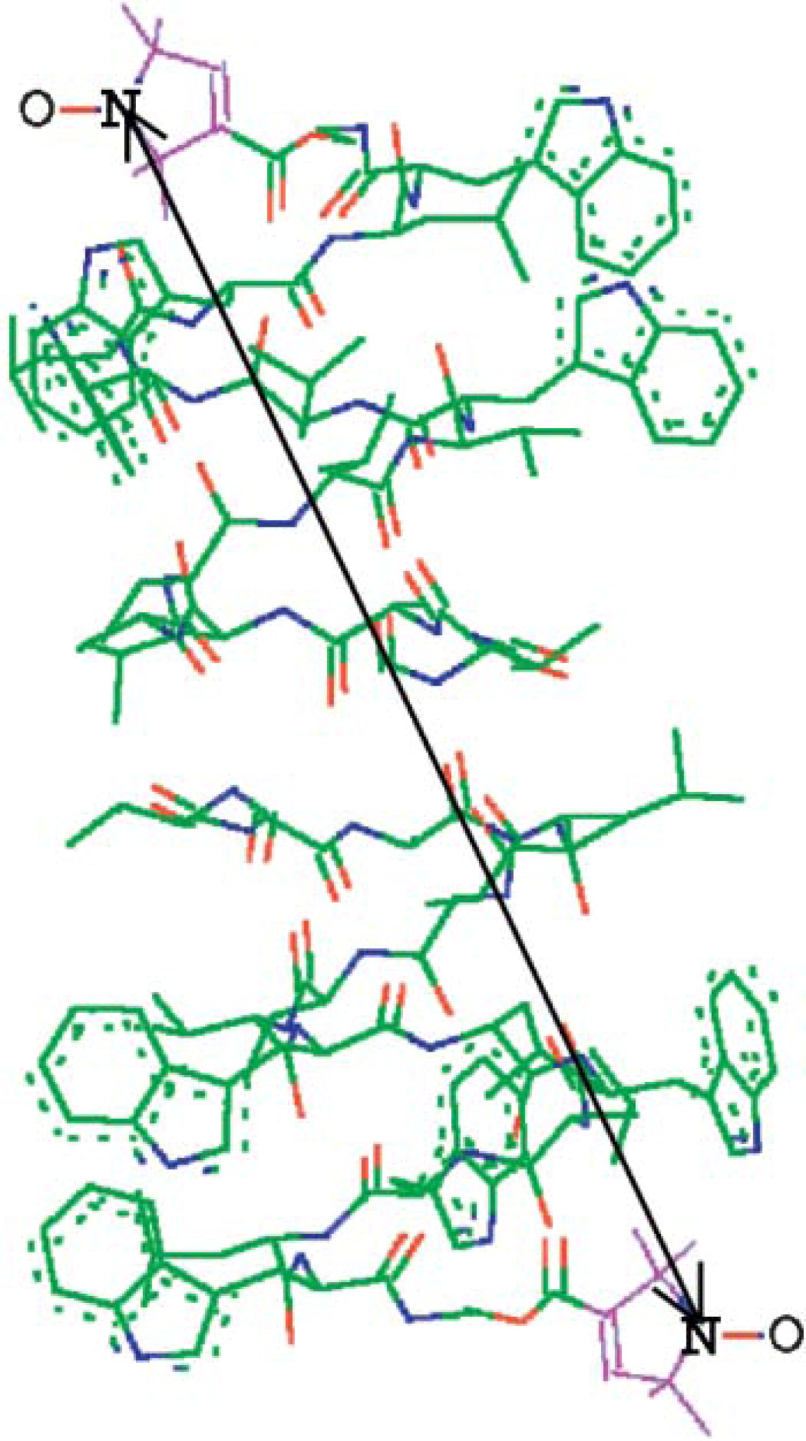 It is generally accepted, that, unlike bulky fluorescent labels, nitroxides are well incorporated into fluid lipid bilayers and not excluded from them. However, it has been shown by NMR that although the most probable location of the nitroxide group for 5-, 10- and 16- PC spin labels in the fluid POPC membrane corresponds to the fully extended conformation, the distribution is relatively broad and other conformations should also be present. Bent conformations were previously found for doxylstearic acids in monomolecular films, water/hydrocarbon emulsion particles and micellar systems. In fluid membranes the fluidity, polarity and accessibility parameters reported by ESR using PC spin labels and n-doxylstearic acids are, in general, change monotonically with an increase in n, although there are indications that the spin label groups on the stearates are located nearer to the membrane exterior than the analogous positions of the unlabeled phospholipid chains. However, in the gel phase, which is characterized by denser chain packing and higher order, the preferential location may be different.