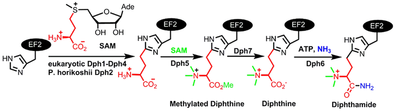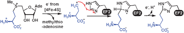 ABSTRACT: Diphthamide, the target of diphtheria toxin, is a unique posttranslational modification on eukaryotic and archaeal translation elongation factor 2 (EF2). The proposed biosynthesis of diphthamide involves three steps and we have recently found that in Pyrococcus horikoshii (P. horikoshii), the first step uses an S-adenosyl-L-methionine (SAM)-dependent [4Fe–4S] enzyme, PhDph2, to catalyze the formation of a C–C bond. Crystal structure shows that PhDph2 is a homodimer and each monomer contains three conserved cysteine residues that can bind a [4Fe–4S] cluster. In the reduced state, the [4Fe–4S] cluster can provide one electron to reductively cleave the bound SAM molecule. However, different from classical radical SAM family of enzymes, biochemical evidence suggest that a 3-amino-3-carboxypropyl radical is generated in PhDph2. Here we present evidence supporting that the 3-amino-3-carboxypropyl radical does not undergo hydrogen abstraction reaction, which is observed for the deoxyadenosyl radical in classical radical SAM enzymes. Instead, the 3-amino-3-carboxypropyl radical is added to the imidazole ring in the pathway towards the formation of the product. Furthermore, our data suggest that the chemistry requires only one [4Fe–4S] cluster to be present in the PhDph2 dimer.