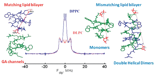 ABSTRACT: Channel and nonchannel forms of gramicidin A (GA) were studied by ESR in various lipid environments using new mono- and double-spin-labeled compounds. For GA channels, we demonstrate here how pulse dipolar ESR can be used to determine the orientation of the membrane-traversing molecule relative to the membrane normal and to study subtle effects of lipid environment on the interspin distance in the spin-labeled gramicidin channel. To study nonchannel forms of gramicidin, pulse dipolar ESR was used first to determine interspin distances corresponding to monomers and double-helical dimers of spin-labeled GA molecules in the organic solvents trifluoroethanol and octanol. The same distances were then observed in membranes. Since detection of nonchannel forms in the membrane is complicated by aggregation, we suppressed any dipolar spectra from intermolecular interspin distances arising from the aggregates by using double-labeled GA in a mixture with excess unlabeled GA. In hydrophobic mismatching lipids (Lβ phase of DPPC), gramicidin channels dissociate into free monomers. The backbone structure of the monomeric form is similar to a monomeric unit of the channel dimer. In addition to channels and monomers, the double-helical conformation of gramicidin is present in some membrane environments. In the gel phase of saturated phosphatidylcholines, the fraction of double helices increases in the following order: DLPC < DMPC < DSPC < DPPC. The equilibrium DHD/monomer ratio in DPPC was determined. In membranes, the double-helical form is present only in aggregates. In addition, we studied the effect of N-terminal substitution in the GA molecule upon channel formation. This work demonstrates how pulsed dipolar ESR may be utilized to study complex equilibria of peptides in membranes.