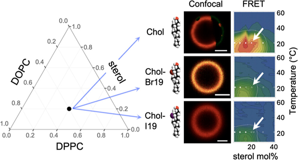 ABSTRACT: Eukaryotic plasma membranes exhibit nanoscale lateral lipid heterogeneity, a feature that is thought to be central to their function. Studying these heterogeneities is challenging since few biophysical methods are capable of detecting domains at submicron length scales. We recently showed that cryogenic electron microscopy (cryo-EM) can directly image nanoscale liquid–liquid phase separation in extruded liposomes due to its ability to resolve the intrinsic thickness and electron density differences of ordered and disordered phases. However, the intensity contrast between these phases is poor compared with conventional fluorescence microscopy and is thus both a limiting factor and a focal point for optimization. Because the fundamental source of intensity contrast is the spatial variation in electron density within the bilayer, lipid modifications aimed at selectively increasing the electron density of one phase might enhance the ability to resolve coexisting phases. To this end, we investigated model membrane mixtures of DPPC/DOPC/cholesterol in which one hydrogen of cholesterol's C19 methyl group was replaced by an electron-rich halogen atom (either bromine or iodine). We characterized the phase behavior as a function of composition and temperature using fluorescence microscopy, Förster resonance energy transfer, and cryo-EM. Our data suggest that halogenated cholesterol variants distribute approximately evenly between liquid-ordered and liquid-disordered phases and are thus ineffective at enhancing the intensity difference between them. Furthermore, replacing more than half of the native cholesterol with halogenated cholesterol variants dramatically reduces the size of the membrane domains. Our results reinforce how small changes in the sterol structure can have a large impact on the lateral organization of membrane lipids.