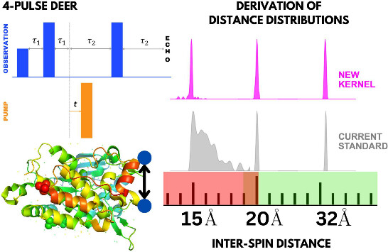 ABSTRACT: Double electron electron resonance (DEER) spectroscopy is an important technique to measure distance distributions P(r) for studying protein structures and protein–protein interactions. DEER data analysis can at times become challenging due to the lack of a detailed analytical signal expression or numerical methods with rapid computation time. We have derived an analytical expression κFULL, which includes both the pseudo-secular dipolar coupling (PSDC) and the finite pulse effects, especially important for shorter distances. Analyses of experiments by κFULL yield accurate and consistent P(r) values for three DEER nitroxide-rulers with distances (rAVG) in the range of 15 to 32 Å, while the current standard analysis produces erroneous results for rAVG < 20 Å. Computation times for deriving P(r) vary between 1 min and 4 min, which is usually much shorter than previous methods that include pseudo-secular and other effects. The expression can be applied to all types of DEER spin probes with little or no modifications.