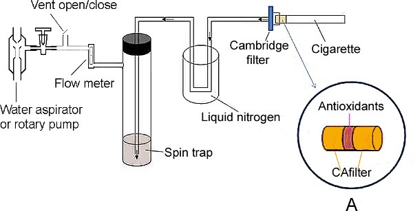 ABSTRACT: Cigarette smoking is associated with human cancers. It has been reported that most of the lung cancer deaths are caused by cigarette smoking. Although tobacco tars and related products in the particle phase of cigarette smoke are major causes of carcinogenic and mutagenic related diseases, cigarette smoke contains significant amounts of free radicals that are also considered as an important group of carcinogens. Free radicals attack cell constituents by damaging protein structure, lipids and DNA sequences and increase the risks of developing various types of cancers. Inhaled radicals produce adducts that contribute to many of the negative health effects of tobacco smoke in the lung. Studies have been conducted to reduce free radicals in cigarette smoke to decrease risks of the smoking-induced damage. It has been reported that haemoglobin and heme-containing compounds could partially scavenge nitric oxide, reactive oxidants and carcinogenic volatile nitrosocompounds of cigarette smoke. A 'bio-filter' consisted of haemoglobin and activated carbon was used to scavenge the free radicals and to remove up to 90% of the free radicals from cigarette smoke. However, due to the cost-ineffectiveness, it has not been successfully commercialized. Another study showed good scavenging efficiency of shikonin, a component of Chinese herbal medicine. In the present study, we report a protocol for introducing common natural antioxidant extracts into the cigarette filter for scavenging gas phase free radicals in cigarette smoke and measurement of the scavenge effect on gas phase free radicals in mainstream cigarette smoke (MCS) using spin-trapping Electron Spin Resonance (ESR) Spectroscopy. We showed high scavenging capacity of lycopene and grape seed extract which could point to their future application in cigarette filters. An important advantage of these prospective scavengers is that they can be obtained in large quantities from byproducts of tomato or wine industry respectively.