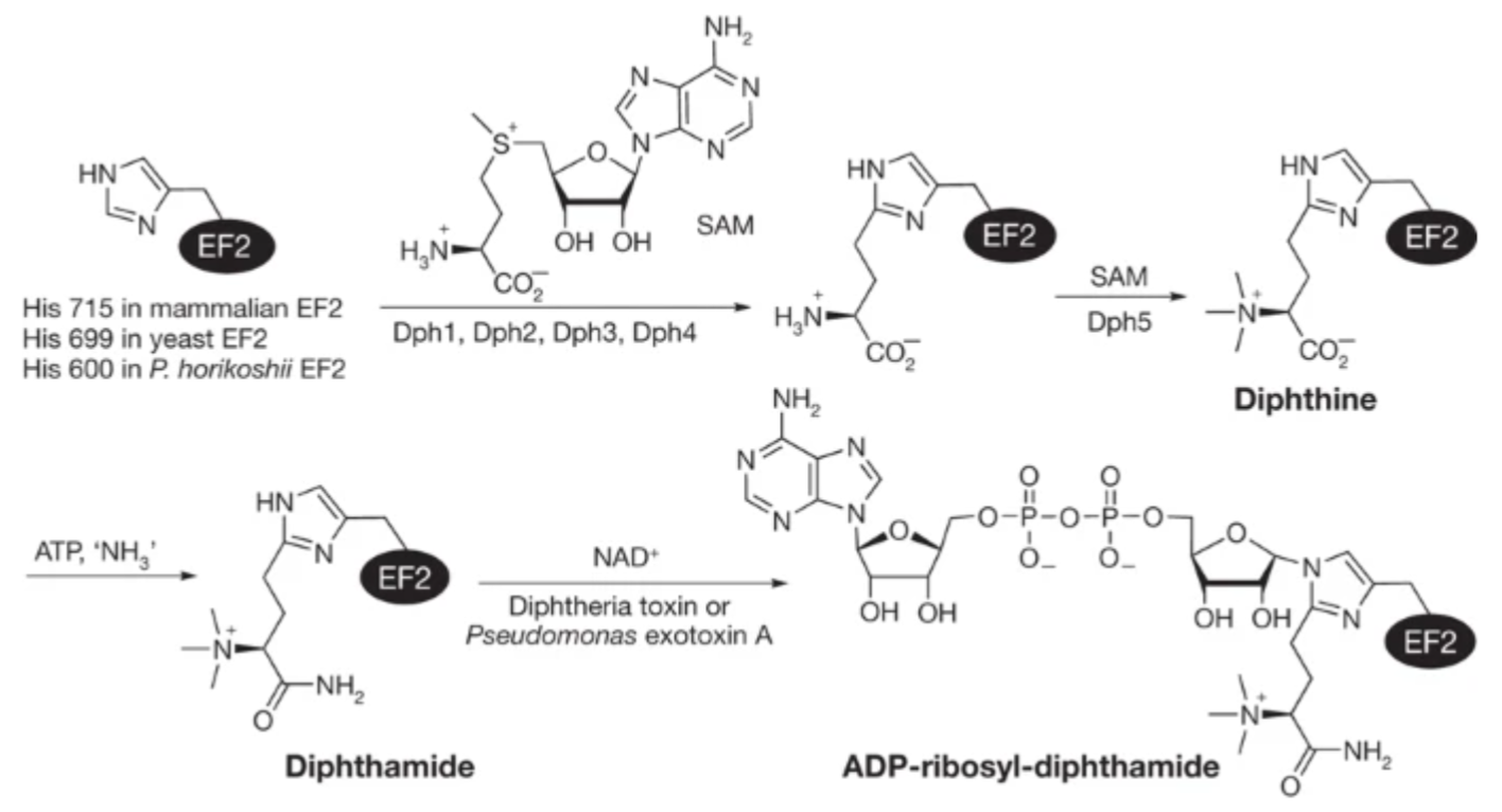 ABSTRACT: Diphthamide, the target of diphtheria toxin, is a post-translationally modified histidine residue found in archaeal and eukaryotic translation elongation factor 2 (EF2). In the first step of diphthamide biosynthesis, a [4Fe–4S] cluster-containing radical SAM enzyme, Dph1–Dph2 heterodimer in eukaryotes or Dph2 homodimer in archaea, cleaves S-adenosylmethionine and transfers the 3-amino-3-carboxypropyl group to EF2. It was demonstrated previously that for the archaeal Dph2 homodimer, only one [4Fe–4S] cluster is necessary for the in vitro activity. Here, we demonstrate that for the eukaryotic Dph1–Dph2 heterodimer, the [4Fe–4S] cluster-binding cysteine residues in each subunit are required for diphthamide biosynthesis to occur in vivo. Furthermore, our in vitro reconstitution experiments with Dph1–Dph2 mutants suggested that the Dph1 cluster serves a catalytic role, while the Dph2 cluster facilitates the reduction of the Dph1 cluster by the physiological reducing system Dph3/Cbr1/NADH. Our results reveal the asymmetric functional roles of the Dph1–Dph2 heterodimer and may help to understand how the Fe–S clusters in radical SAM enzymes are reduced in biology.
